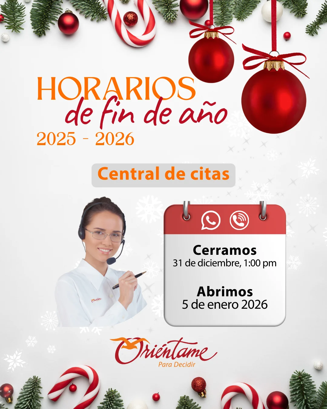 Este fin de año 2025 te invitamos a programar tus citas con suficiente anticipación, conoce los horarios de cierres de los puntos de atención presencial y de nuestra Central de citas para atención teléfónica y vía WhatsApp.